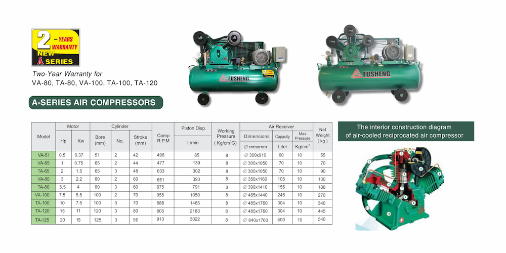 Fusheng VA Series thuộc dòng máy nén khí piston có dầu (lubricated type), được sản xuất với công nghệ tiên tiến và tiêu chuẩn kiểm định nghiêm ngặt của Fusheng – thương hiệu Đài Loan có mặt tại hơn 60 quốc gia.
